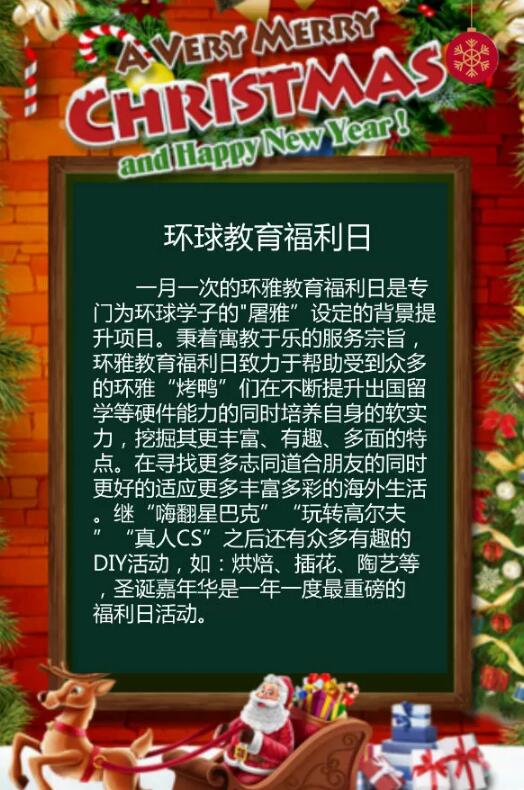 圣诞的时候写封信相邀“屠雅”的你,开头要遣词造句,中间要马马虎虎,结尾要署上匿名。你会把它放在抽屉最里边吗?还是会不屑一顾呢?冬天的时候你从大霾里走来,刻下灰色的你;夏天的时候你从阳光里走来,眼含金色的诗意;秋天落叶满地、冬天芳草萋萋;你一直坚持努力,不离不弃。让时间停一停,让你我欢聚,"环球教育之首届圣诞嘉年华"!
