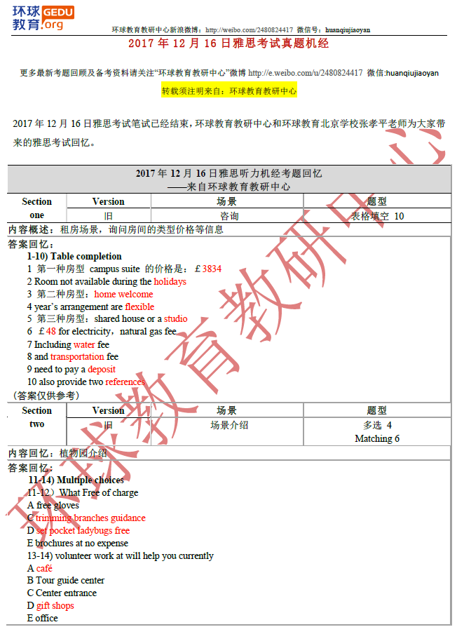 环球教育教研中心的名师们此次为大家送上2017年12月16日雅思听力考试回忆及答案,希望对大家备考雅思有所帮助!